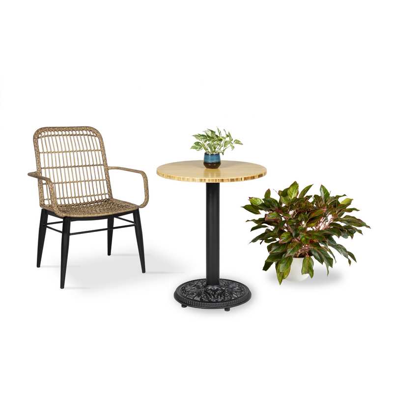 - Bàn cafe có mặt tre tự nhiên mang lại vẻ đẹp thân thiện với môi trường, thân sắt ống bền vững và đế chân gang họa tiết tinh tế.