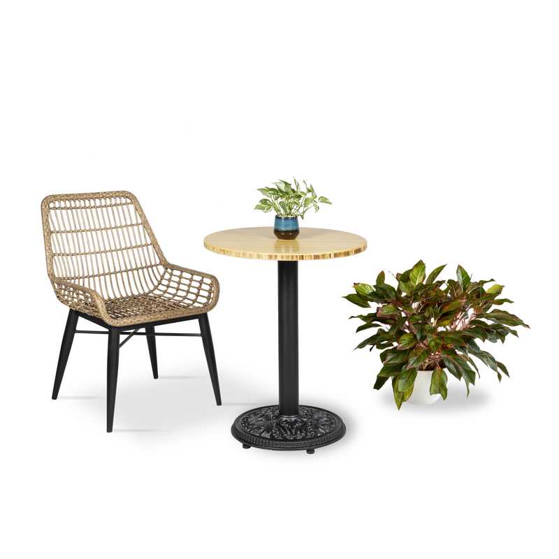 - Bàn cafe có mặt tre tự nhiên thân thiện với môi trường cùng thân sắt ống sơn tĩnh điện bền đẹp và đế chân gang vững chãi.
