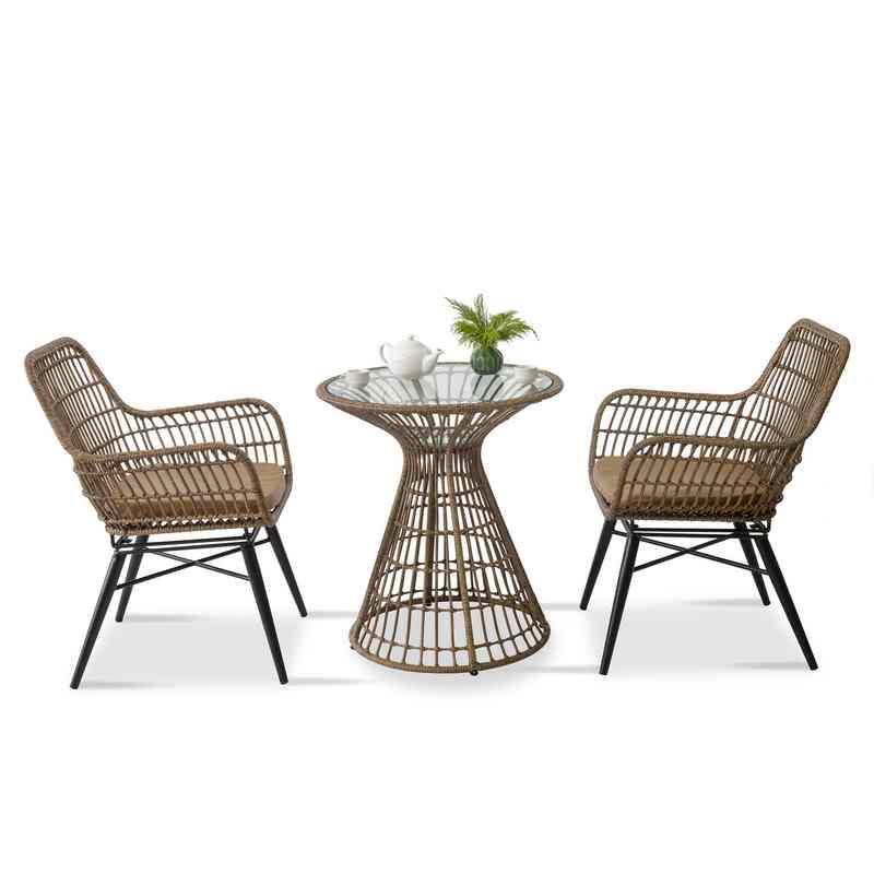 - Ghế cafe được đan từ nhựa giả mây bền bỉ kết hợp với khung sắt sơn tĩnh điện chống gỉ sét, đảm bảo độ bền lâu dài ngay cả khi sử dụng ngoài trời.