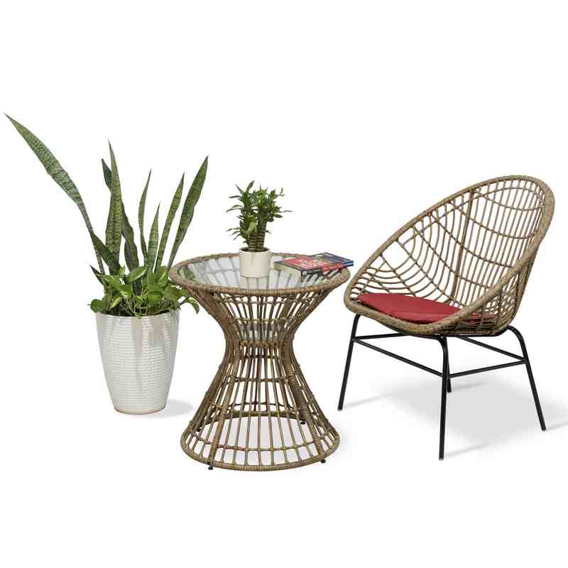 - Ghế cafe được làm từ nhựa giả mây đan chắc chắn kết hợp với khung sắt sơn tĩnh điện chống gỉ sét cùng nệm simili mềm mại.