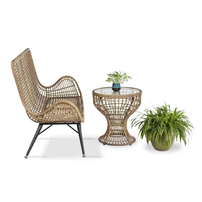 - Ghế được đan nhựa giả mây màu vàng tạo cảm giác tự nhiên, kết hợp với khung sắt sơn tĩnh điện bền bỉ và chân sắt ống chắc chắn.
