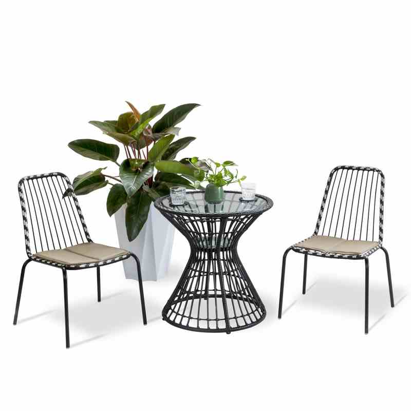- Ghế được đan viền nhựa giả mây trắng đen kết hợp với khung sắt sơn tĩnh điện cùng nệm ngồi simili mang lại cảm giác thoải mái khi sử dụng.