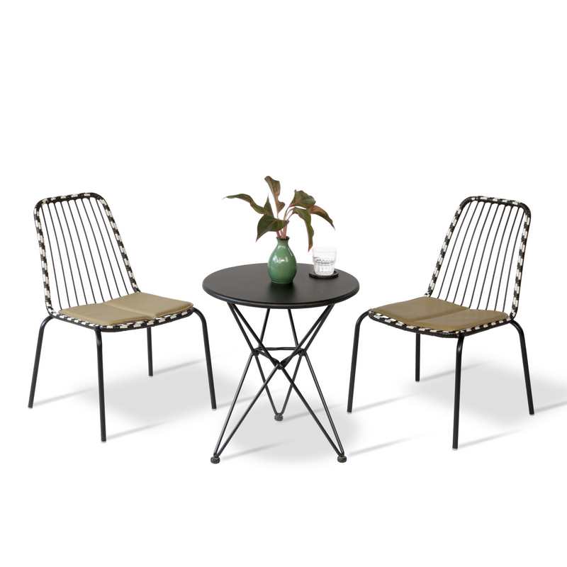 - Ghế được đan viền nhựa giả mây trắng đen kết hợp với khung sắt sơn tĩnh điện cùng nệm ngồi simili mang lại cảm giác thoải mái và bền bỉ.