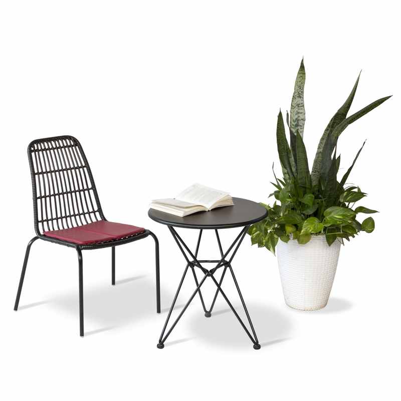 - Ghế Cafe: Được đan bằng nhựa giả mây, mang đến vẻ đẹp tự nhiên nhưng vẫn rất hiện đại. Chất liệu này không chỉ nhẹ mà còn chống chịu tốt với thời tiết khắc nghiệt. Khung sắt sơn tĩnh điện giúp sản phẩm chống gỉ sét hiệu quả và tăng cường độ bền. Nệm ngồi simili cao cấp mang lại cảm giác êm ái và dễ dàng vệ sinh.