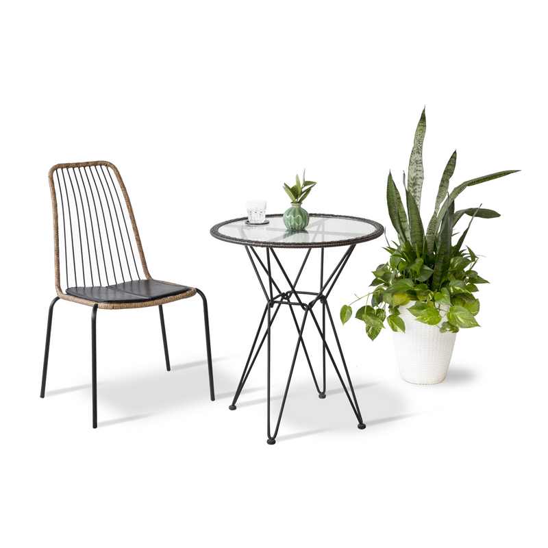 - Một trong những điểm nổi bật của bộ bàn ghế này chính là thiết kế tinh tế với ghế đan viền nhựa giả mây.