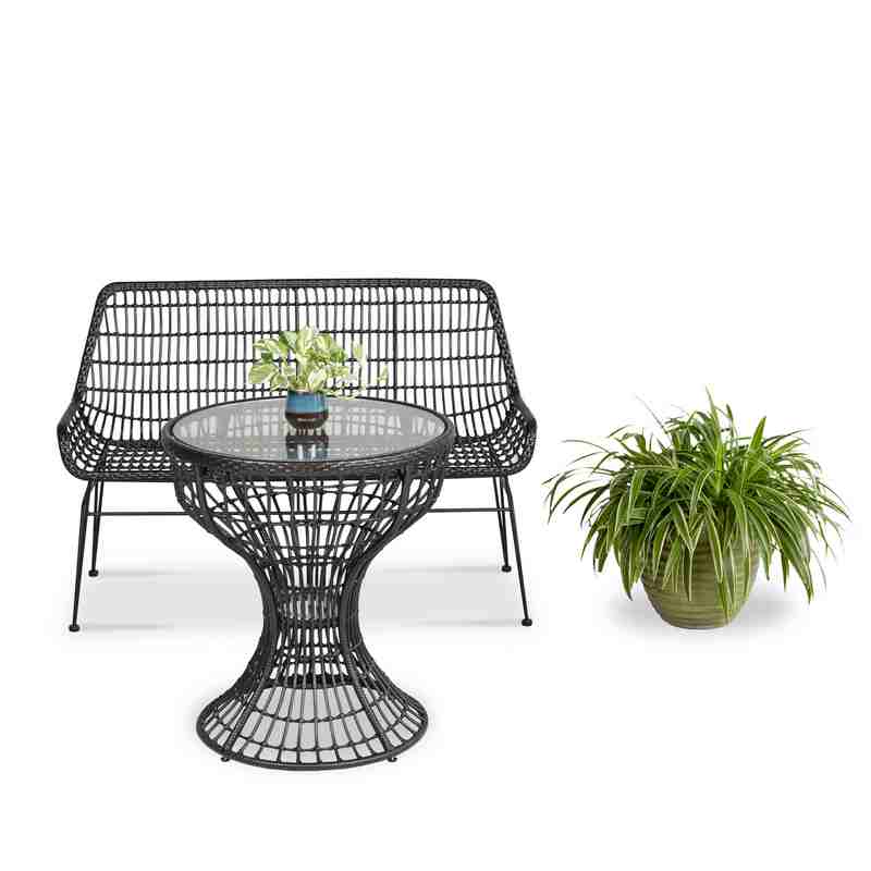 - Bàn cafe cũng sử dụng mặt kính trong suốt kết hợp với đan nhựa giả mây màu nâu đen và khung sắt sơn tĩnh điện, có nút tăng chỉnh chân để điều chỉnh độ cân bằng trên mọi địa hình.