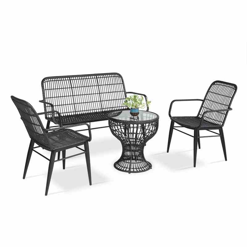 - Ghế được đan từ nhựa giả mây bền đẹp kết hợp với khung sắt sơn tĩnh điện chống gỉ sét, mang lại độ bền vượt trội.