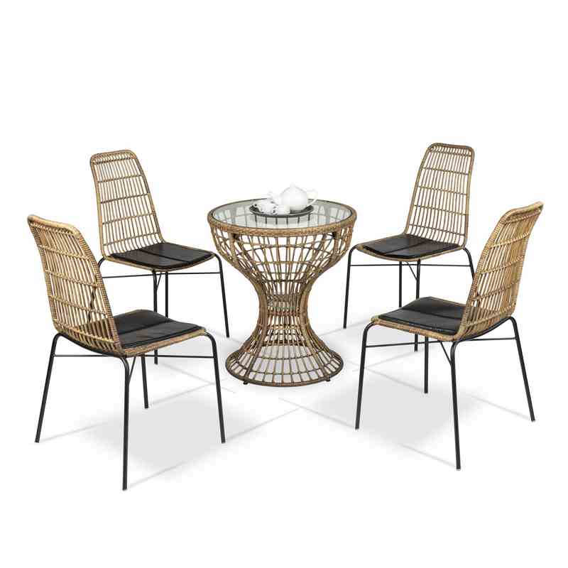 - Ghế cafe của bộ sản phẩm được đan từ nhựa giả mây bền bỉ kết hợp với khung sắt sơn tĩnh điện chống gỉ sét, cùng nệm simili mềm mại mang đến cảm giác thoải mái khi ngồi.