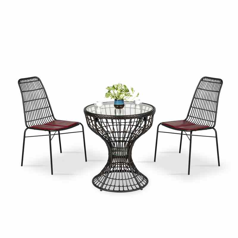 - Ghế cafe được đan từ nhựa giả mây nâu đen kết hợp với khung sắt sơn tĩnh điện chắc chắn cùng nệm simili mềm mại, mang lại cảm giác thoải mái khi ngồi.